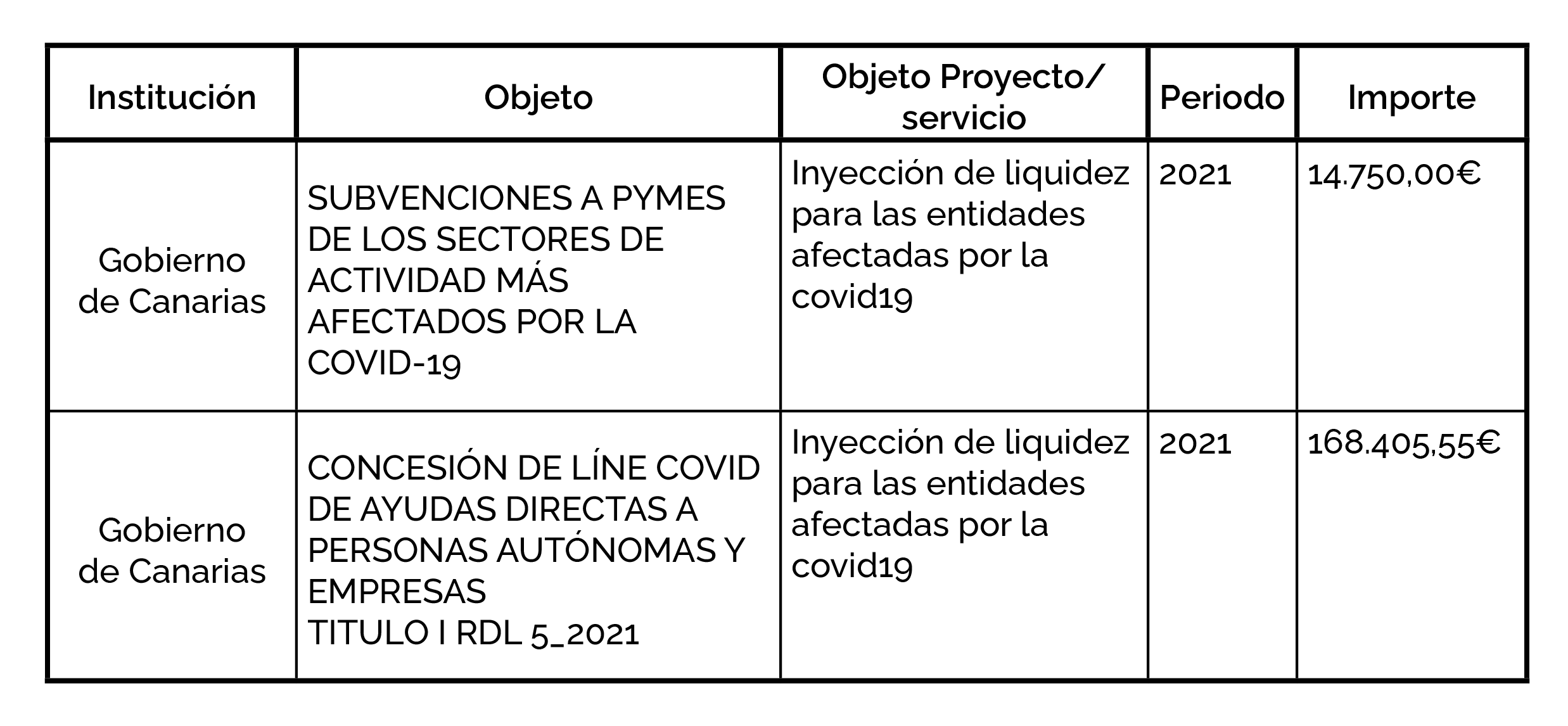 La empresa CAFETERÍA BERLÍN CANARIAS SL presenta anualmente los contratos, convenios, encomiendas de gestión y subvenciones, realizados con las administraciones públicas y entidades privadas. A continuación difundimos la información sobre los convenios y subvenciones públicas suscritos: